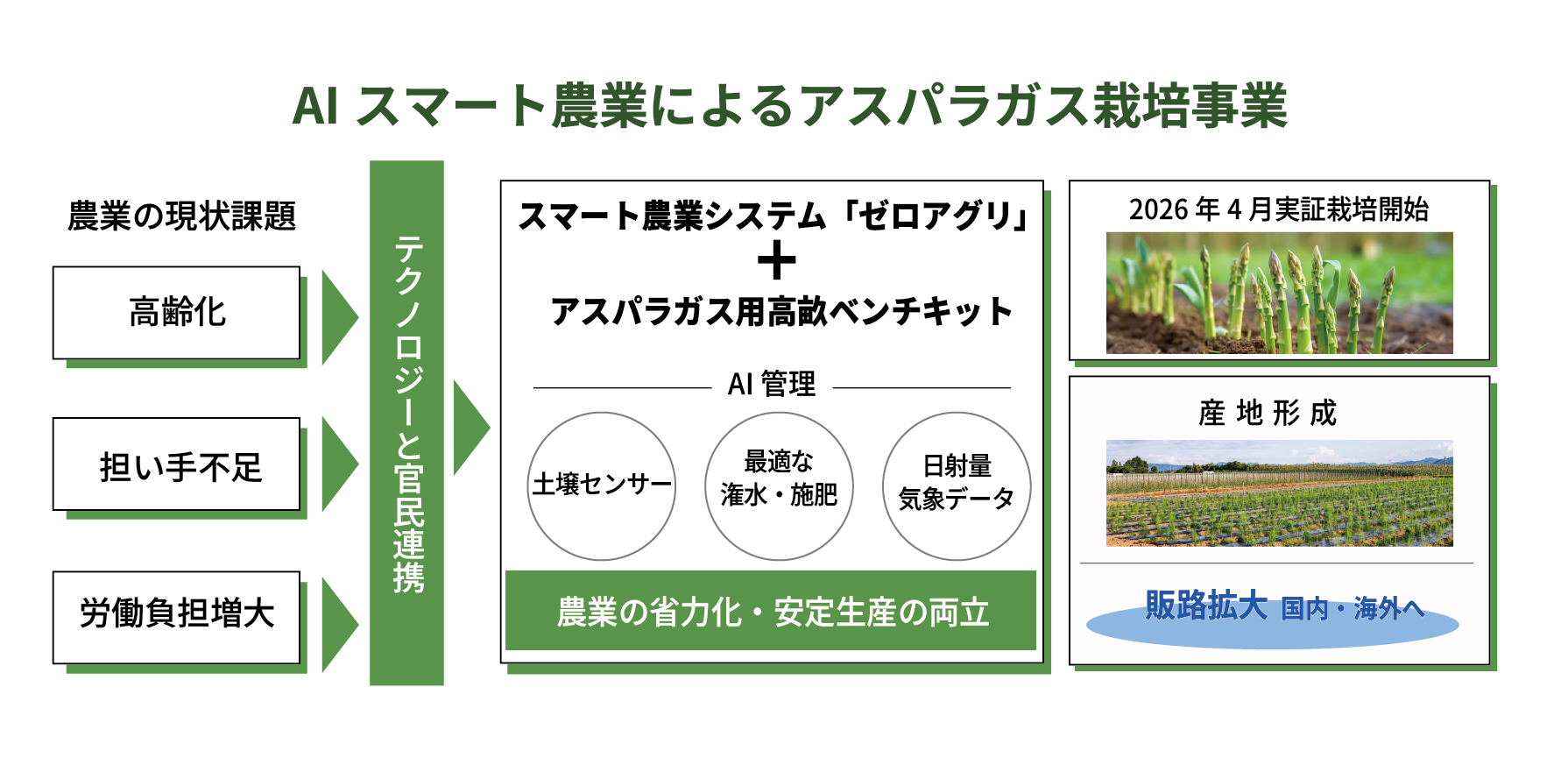 本事業では、「アスパラガス用高畝ベンチキット」(※2)及びAIスマート農業システム「ゼロアグリ」を活用し、農業の省力化と安定生産の両立を図ります。
